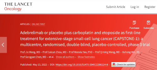 北京时间2022年5月14日,开云体育医药自主研发的PD-L1抑制剂阿得贝利单抗治疗广泛期小细胞肺癌的III期临床研究(CAPSTONE-1研究)成果正式全文在线发表于国际权威学术期刊《柳叶刀·肿瘤学》(《THE LANCET Oncology》,影响因子41.316)。CAPSTONE-1研究结果显示,阿得贝利单抗联合化疗一线治疗广泛期小细胞肺癌相较于安慰剂联合化疗可以显著延长患者总生存期至15.3个月[1],刷新现有免疫药物一线治疗广泛期小细胞肺癌的总生存纪录[2]