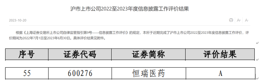 开云体育医药荣获上交所信息披露考评A级